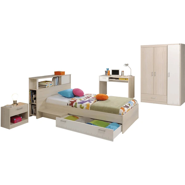 Die helle und freundliche Optik dieses Zimmers fällt sofort ins Auge! Bestehend aus einem Jugendbett mit Anstellregal und Schubkasten, Nachtkommode, Kleiderschrank und Schreibtisch bietet es alles wichtige für das moderne Jugendzimmer.Maße: Kleiderschrank (B112 x H179 x T52 cm; Bett (B121 x H67 x T203 cm); Bettschubkasten (B121 x H19 x T40 cm); Anstellregal (B123 x H93 x T29 cm); Schreibtisch (B109 x H75 x T59 cm); Nako (B44 x H40 x T28 cm)Lieferumfang: Kleiderschrank 3-trg, Bett, Anstellregal, Schreibtisch, Nako, Montagematerial und Montageanleitung (ohne Matratzen, Lattenrost und Deko)