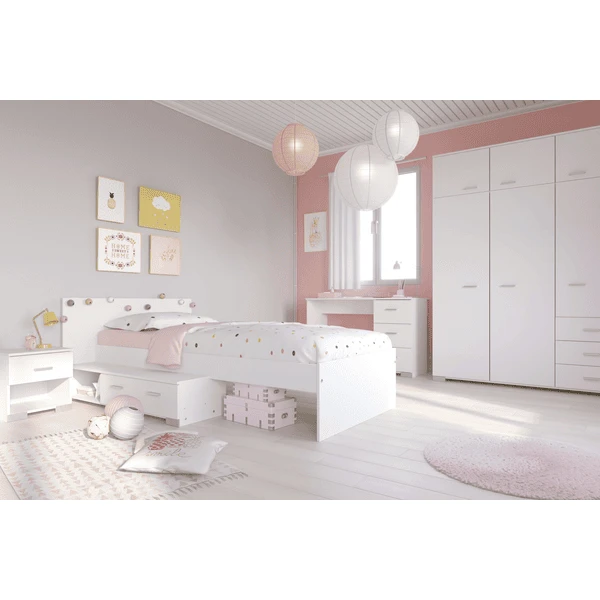 Diese schöne Kinderzimmer besteht aus einem 6-türigen Kleiderschrank, einem Schreibtisch sowie einem Bett mit extra Stauraum sowie einer passenden Nachtkommode.Maße: Kleiderschrank (B146 x H203 x T55 cm), Schreibtisch (B120 x H75 x T50 cm), Stauraumbett (B120 x H74 x L203 cm), Nako (B40 x H40 x T33 cm)Lieferumfang: Kleiderschrank 6trg, Schreibtisch, Stauraumbett, Nachtkommode (ohne Lattenrost, Matratze und Dekoration)